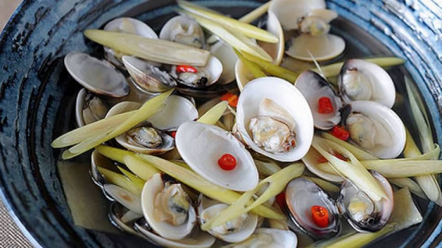 - Ngao mua về ngâm nước cho ra sạch bùn đất. Rồi rửa sạch. Cho vào nồi nước cùng 1 thìa cà phê muối luộc đến khi ngao tách ra.