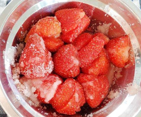 Bước 1: Dâu tây rửa sạch, cho vào bát tô cùng 70g đường + nước cốt chanh trộn đều hỗn hợp và cho vào ngăn đá tủ lạnh khoảng 30 phút.