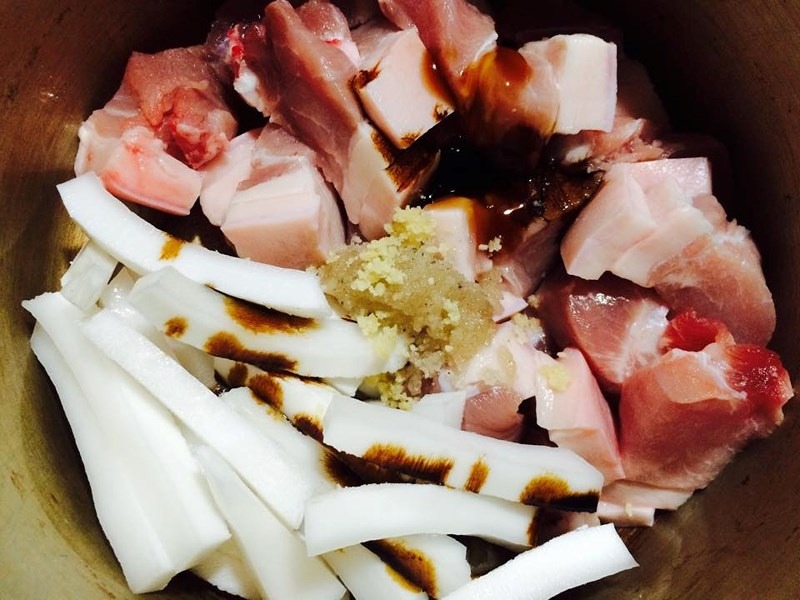 Cho thịt vào nồi cùng với muối, bột ngọt, tiêu, nước màu rồi đảo đều và ướp thịt 30 phút cho ngấm gia vị.