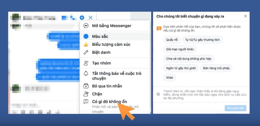 Để làm điều này, bạn cần click vào ô hoa thị trên khung chat của người mà mình muốn báo cáo > chọn “Có gì đó không ổn” > chọn hạng mục để báo cáo > click Gửi phản hồi > chọn Báo cáo cuộc trò chuyện > báo cáo cuộc trò chuyện để gửi cho Facebook xem xét.