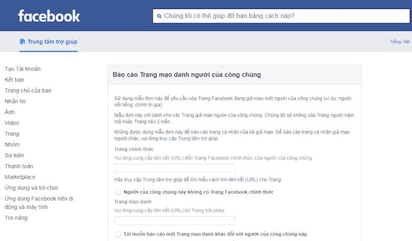 Người dùng cũng có thể điền vào mẫu tại đây để báo cáo Trang mạo danh người của công chúng.