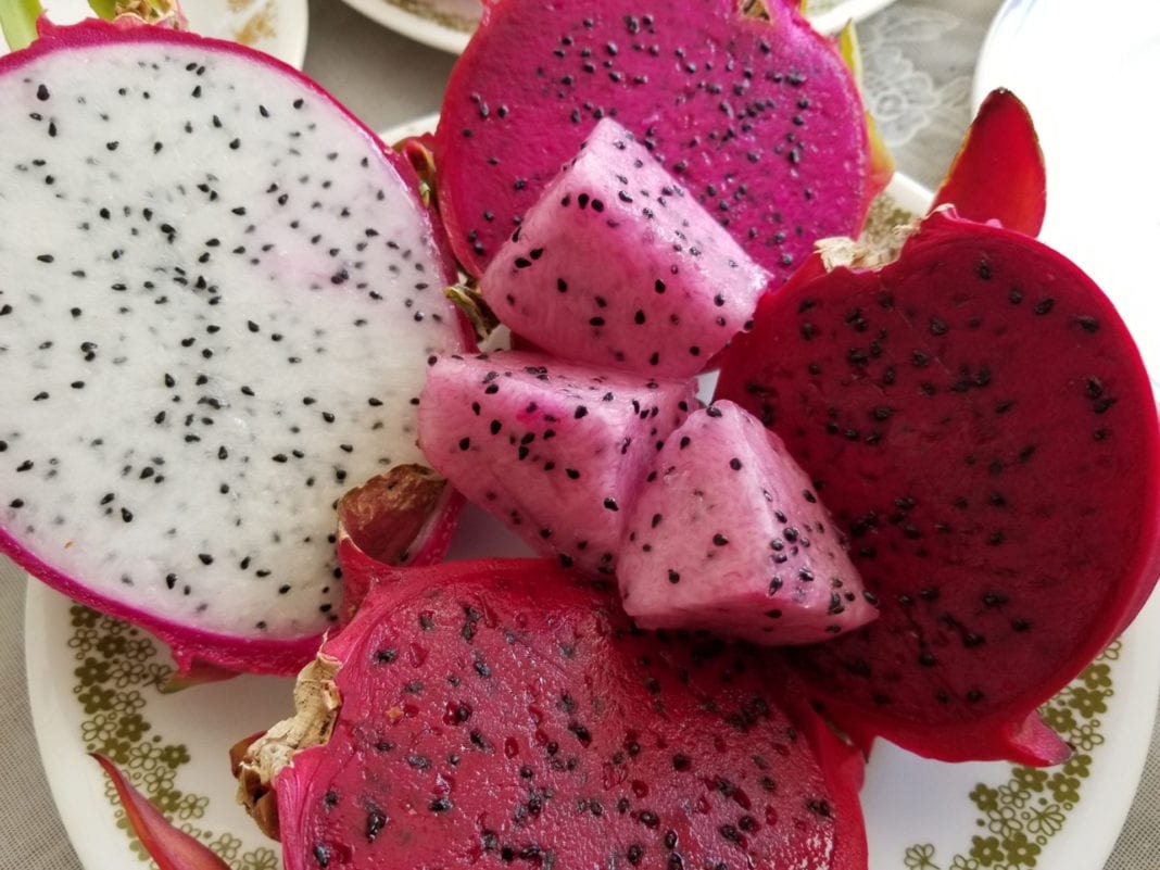 Giống thanh long ruột trắng mà ông Nguyễn Ngọc Ổn lai tạo, tuy có vẻ bề ngoài không đỏ đẹp nhưng lại ngọt, không có vị chua. (Hình: Tâm An/Người Việt)