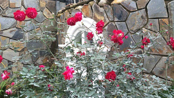Bao quanh căn nhà là những lối đi lát đá, được phủ xanh bằng những thảm cỏ non với cây cối xanh tốt quanh năm.