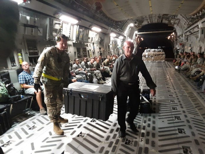 Hai quân nhân Mỹ khiêng một trong những thùng hài cốt của 81 quân nhân VNCH. (Hình: jameswebb.com)