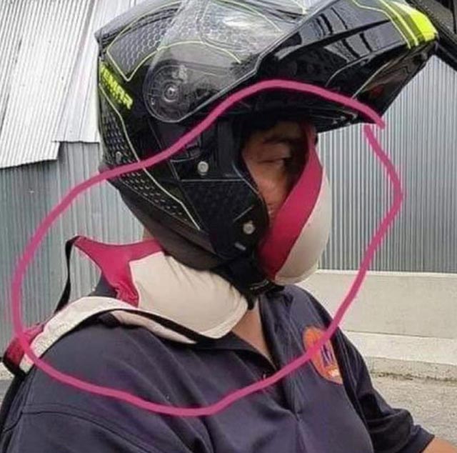 Hình ảnh được chia sẻ cho thấy, một người đàn ông đội mũ bảo hiểm đang đi trên đường. Tuy nhiên, thay vì đeo khẩu trang thì người đàn ông này đã che chắn khuôn mặt của mình bằng 1 bên của áo ngực.