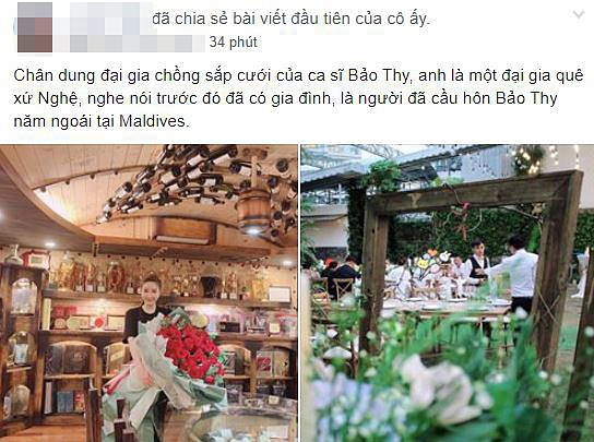 Trên một diễn đàn showbiz, tài khoản đăng tải loạt ảnh viết: "Chân dung đại gia - chồng sắp cưới của ca sĩ Bảo Thy. Anh là một đại gia quê xứ Nghệ, nghe nói trước đó đã có gia đình. Anh là người đã cầu hôn Bảo Thy năm ngoái tại Maldives".