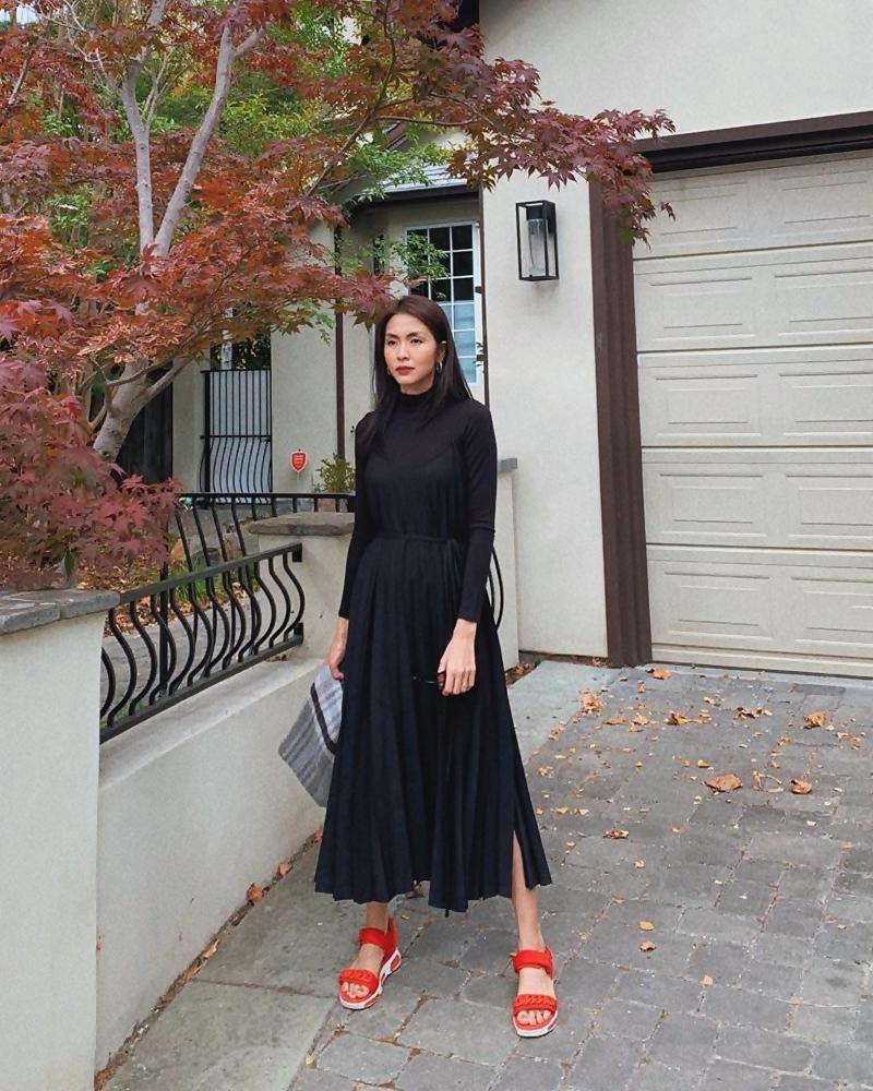 Chỉ với một đôi sandals màu cam rực rỡ, Tăng Thanh Hà đã “thắp sáng” thành công bộ đầm đen thắt eo, tạo được điểm nhấn “đắt giá” cho bộ cánh mang đậm cảm hứng tối giản.