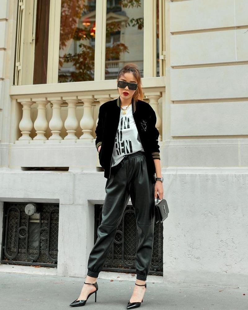 Kỳ Duyên xuống phố ngày se lạnh với combo áo thun trắng và quần da tuyền đen, khoác ngoài là áo bomber bằng nhung, vừa giữ ấm vừa nhấn mạnh nét năng động. Bộ ba phụ kiện giày, túi và kính mắt ton-sur-ton cũng giúp Hoa hậu Việt Nam 2014 thêm “ngầu”.