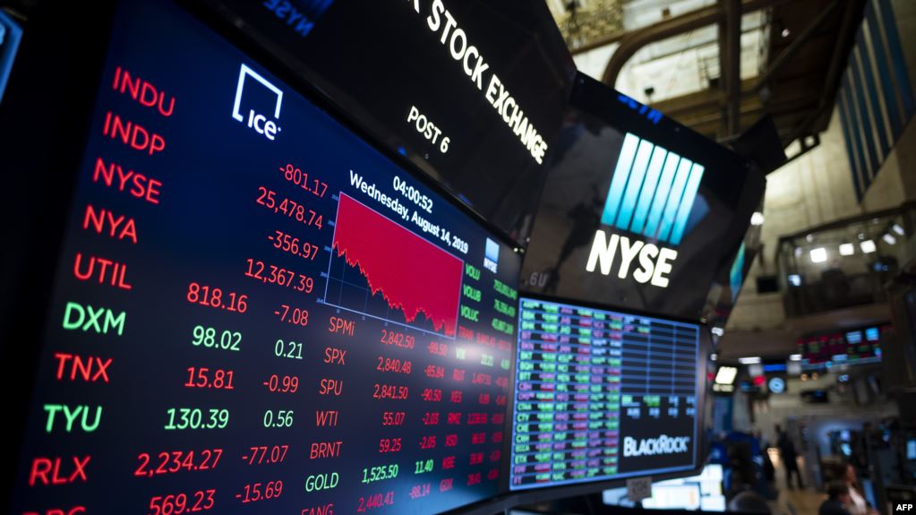 Tư liệu: Màn ảnh truyền hình với bảng giá chứng khoán trước khi thị trường chứng khoán New York đóng cửa hôm 14/8/2019, ngày mà giá cổ phần rớt giá mạnh và có dấu hiệu kinh tế có thể suy thoái. (Photo by Johannes EISELE / AFP)