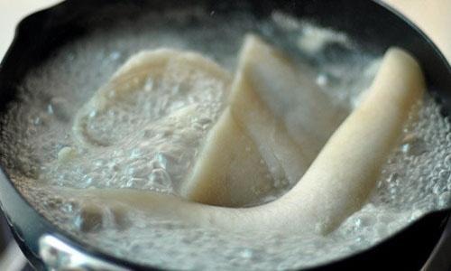 - Bước 1: Bì heo rửa sạch, luộc chín trong nồi nước sôi.