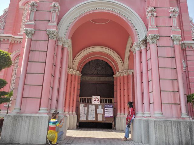 Toàn bộ tường nhà thờ được sơn màu hồng khiến du khách thích thú.