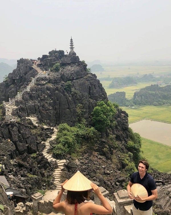 Như nhiều du khách khác, Á hậu và chồng sắp cưới leo hơn 500 bậc thang đá để chinh phục hang Múa, một trong những điểm đến hot nhất đất cố đô. Trời nắng nên hai người mua nón lá, không quên chụp ảnh sống ảo ở đây.