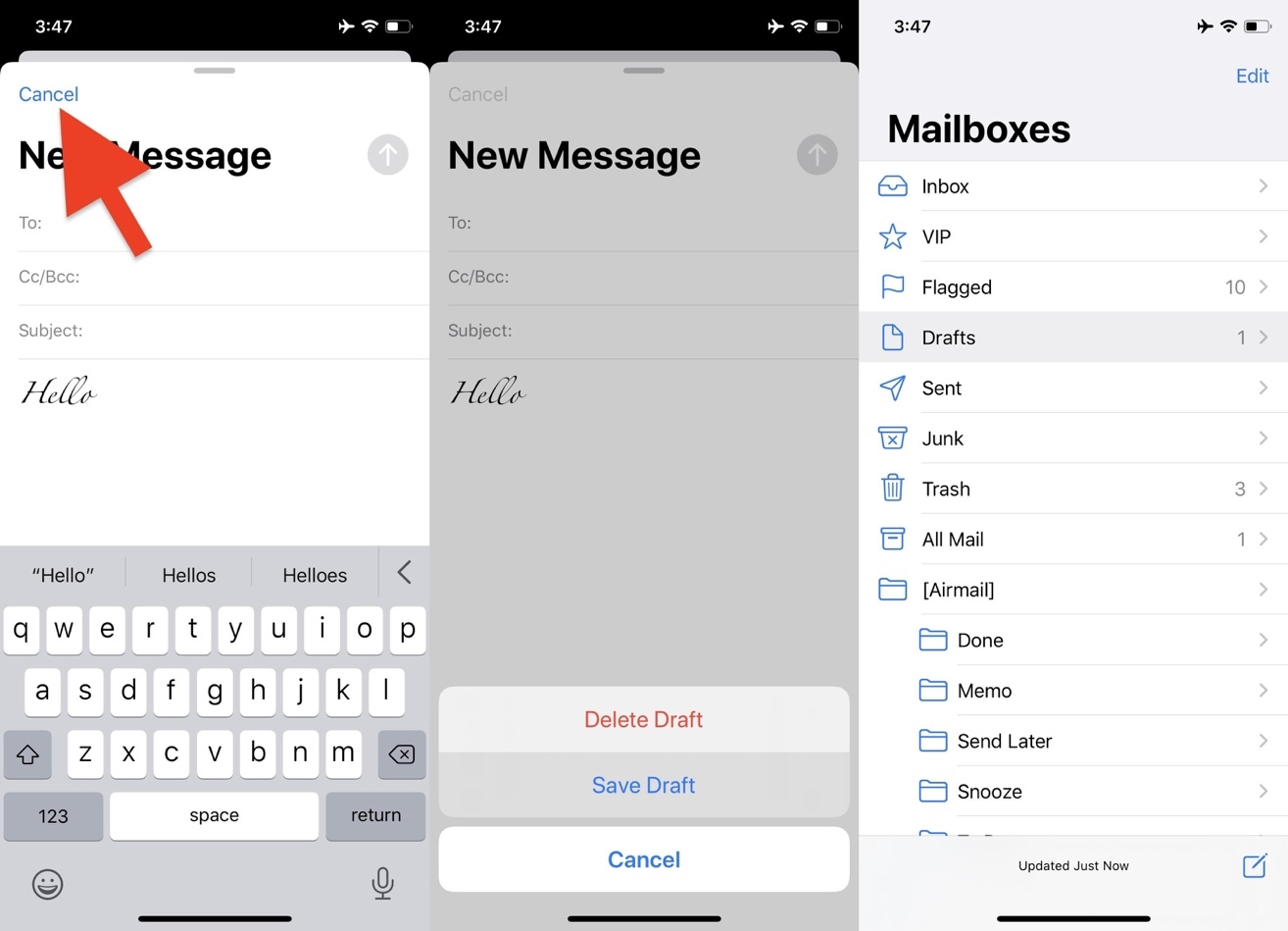 Cách đơn giản và hiệu quả nhất để khôi phục phông chữ San Francisco khi soạn thư trên ứng dụng Mail là lưu thư thành bản nháp, sau đó mở lại bản nháp đó. Để làm thế, bạn bấm nút Cancel, sau đó bấm nút Save Draft. Bây giờ, bạn mở thư mục Draft từ trình đơn chính và chọn thư bạn vừa lưu.