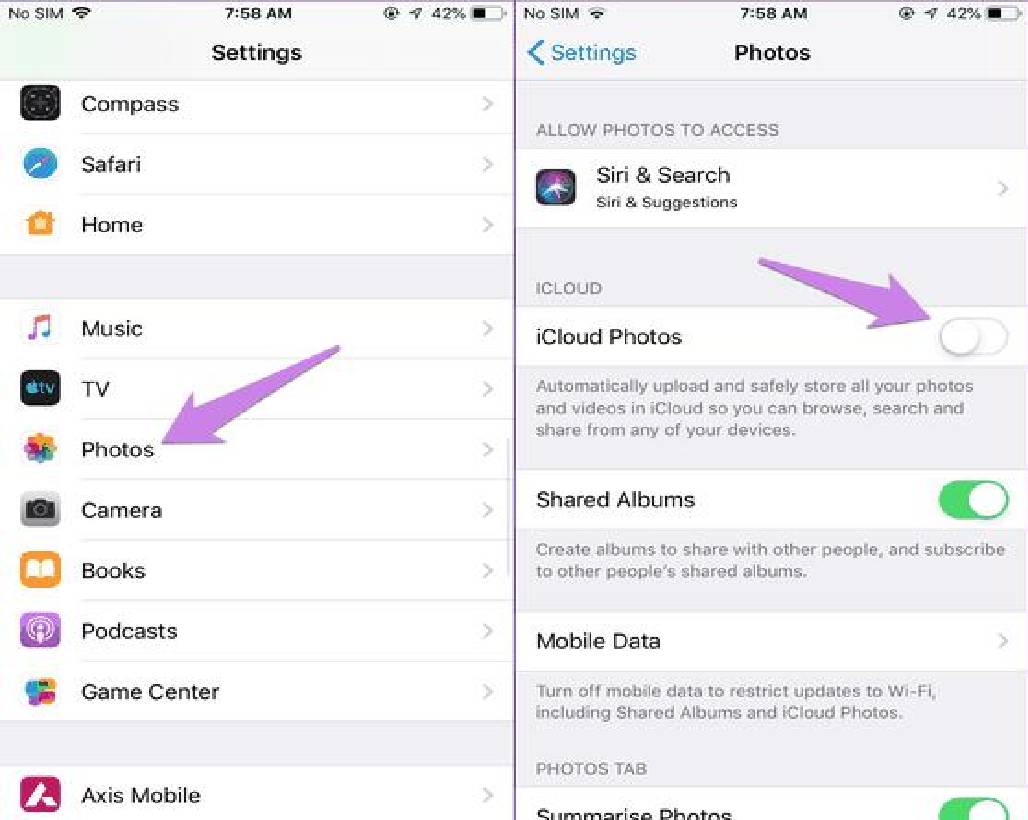 - Bước 3: Để đưa những tấm ảnh vừa tải xuống lên iCloud, bạn hãy vào Settings (cài đặt) - Photos (ảnh) và kích hoạt tùy chọn iCloud Photos. Trong trường hợp nó đã được bật thì bạn nên giữ nguyên.