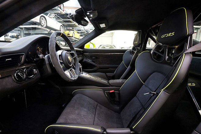 Bên trong khoang lái, Porsche 911 GT3 RS có ghế xe đua bọc bằng da Alcantara cao cấp màu đen viền xanh vàng. Ngoài ra, còn nhiều chi tiết bằng sợi carbon và ốp bạc Galvano tạo nên điểm nhấn cho chiếc xe.