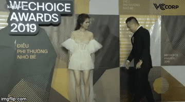 Giây phút Ngọc Trinh diện bộ váy xuyên thấu siêu ngắn gợi cảm nhưng bị Vũ Khắc Tiệp vô tình giẫm vào đuôi váy khiến "nữ hoàng nội y" bị vấp tại sự kiện gây chú ý.
