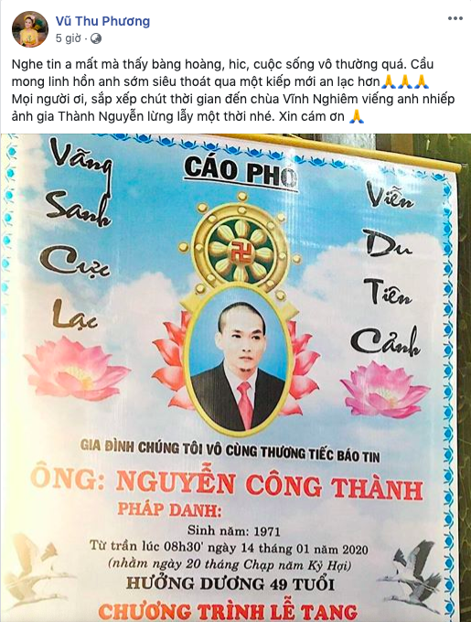 Siêu mẫu Vũ Thu Phương thì bàng hoàng, đau đớn: "Nghe tin anh mất mà thấy bàng hoàng, cuộc sống vô thường quá. Cầu mong linh hồn anh sớm siêu thoát qua một kiếp mới an lạc hơn".