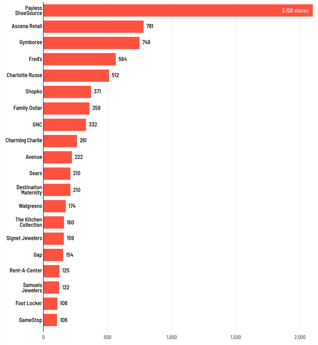 Theo Coresight, các hãng bán lẻ Payless, Gymboree, Charlotte Russe và Shopko đều đệ đơn xin phá sản và đóng cửa tổng cộng 3.720 cửa hàng. Phần lớn trong số này thuộc về Payless, công ty xin phá sản lần hai vào tháng 2 và đóng cửa 2.100 cửa hàng tại Mỹ.