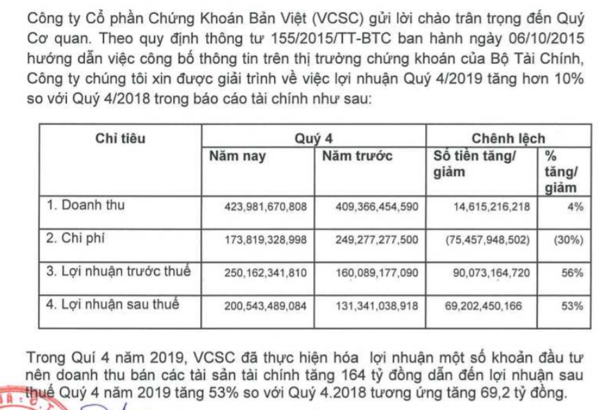Theo lý giải từ công ty chứng khoán Bản Việt, trong quý IV/2019, VCSC đã thực hiện hóa lợi nhuận một số khoản đầu tư nên doanh thu bán các tài sản tài chính tăng 164 tỷ đồng dẫn tới lợi nhuận sau thuế quý IV/2019 tăng đột biến 53%, tương ứng tăng 69,2 tỷ đồng.