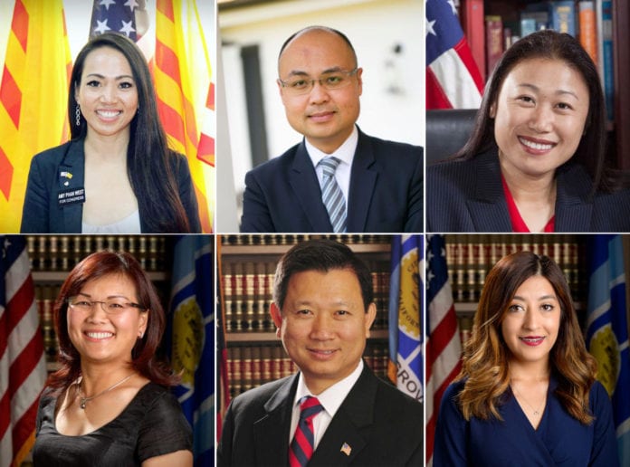 Sáu ứng cử viên gốc Việt, từ trái, cô Amy Phan West, Dân Biểu Tyler Diệp, bà Janet Nguyễn, Nghị Viên Diedre Thu Hà Nguyễn, Giám Sát Viên Andrew Đỗ, Nghị Viên Kim Bernice Nguyễn. (Hình: NV)