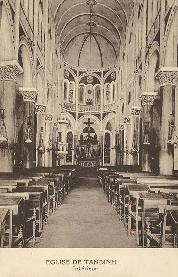Bên trong thánh đường của nhà thờ Tân Định thời thuộc địa. Về tổng thể, nhà thờ mang phong cách kiến trúc Gothic, nhưng các chi tiết trang trí lại mang ảnh hưởng phong cách Roman và Baroque.