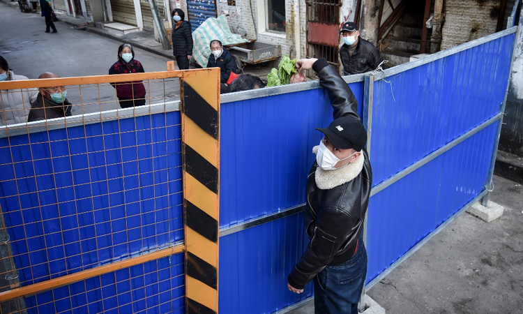 Một người đưa rau sang phía bên kia rào chắn tại thành phố Vũ Hán, tỉnh Hồ Bắc, Trung Quốc hôm 23/2. Ảnh: AFP.