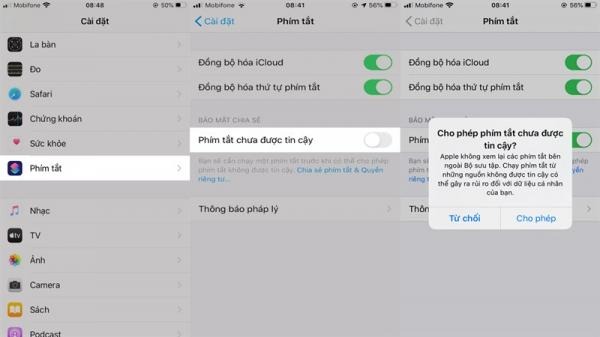 Bước 2. Sau khi cài Phím tắt thàn*h công. Bạn vào Cài đặt > Phím tắt > trong mục Bảo mật Chia sẻ, bạn bật tính năng Phím tắt chưa được tin cậy. Trường hợp nút này bị ẩn không gạt được, bạn cần chạy một phím tắt bấ*t kì trước khi mở tính năng này.