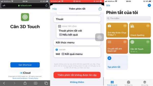 Bước 3. Bạn tru*y cập link phím tắt Cân 3D Touch bằng Safari. Tiến hàn*h Nhậ*n Phím Tắt vào ứng dụng Shortcuts là xong.