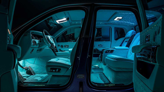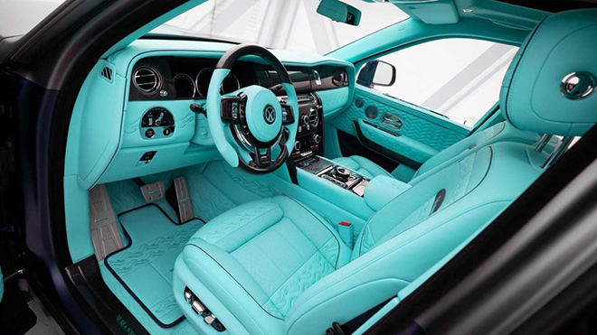 Khoang cabin gây choáng ngợp với vẻ đẹp mang sắc màu ngọc lam quý phái, sự tinh tế xuất hiện ngay cả trên một số chi tiết nhỏ nhất như ghế trẻ em. Biểu tượng Spirit of Ecstasy đặt tại đầu mui xe cũng được phủ một màu ngọc lam thu hút, tương tự như các nan dọc của lưới tản nhiệt hay đường chỉ kéo ngang thân xe, phân cách giữa 2 màu sơn Xanh Đại dương và Bạc Secret.