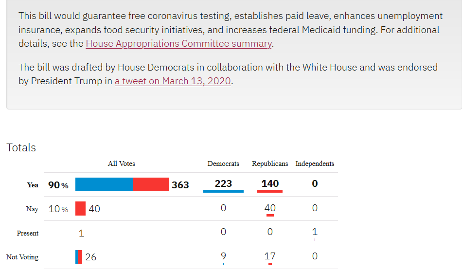 This bill would guarantee free coronavirus testing, establishes paid leave, enhances unemployment insurance, expands food security initiatives, and increases federal Medicaid funding. For additional details, see the House Appropriations Committee summary.