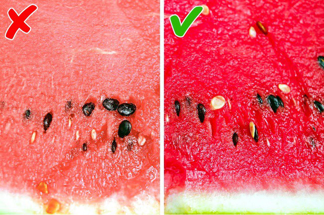 Dưa hấu: Dưa hấu có thể khác biệt ở bên ngoài do giống của nó, nhưng ở bên trong, nó luôn luôn phải có màu hồng đỏ hoặc màu đỏ đậm. Bất kỳ sự đổi màu nào như màu hồng nhạt, màu trắng hồng có nghĩa là quả dưa đã quá cũ.