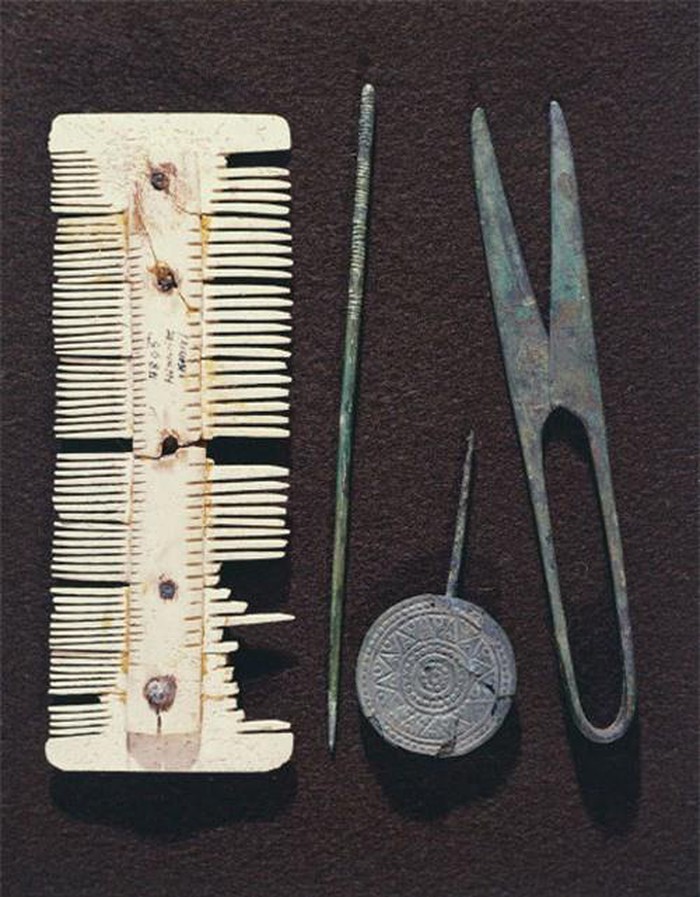 1. Lược làm từ xương động vật (thế kỷ thứ 5 đến thế kỷ 8 SCN): Từ thế kỷ thứ 5 đến thế kỷ 8 SCN, những người dân của nền văn minh cổ đại Merovingian (mà ngày nay thuộc nướcPháp và Đức) làm mượt mái tóc của mình với những chiếc lược làm bằng xương động vật. Trong ảnh còn có chiếc kéo và trâm cài tóc ghi dấu ấn của một triều đại sang trọng.