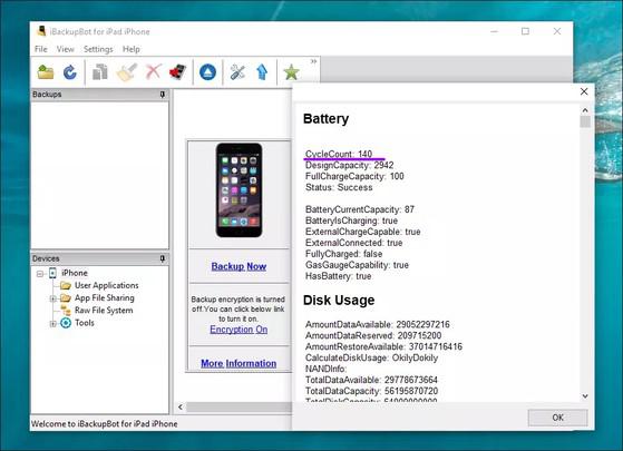 iBackupBot là một tiện ích sao lưu iPhone, cho phép người dùng kiểm tra chu kỳ sạc tương tự như iMazing. Tuy nhiên, đây là một phần mềm có phí, nhưng bạn có thể dùng thử trong vòng 7 ngày (không cần thông tin thanh toán), như vậy đã là đã đủ cho nhu cầu trước mắt.