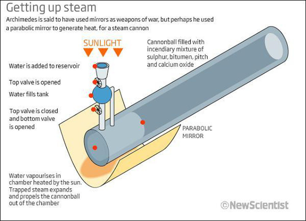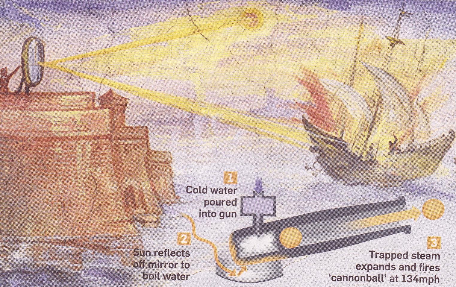 Một trong những vũ khí huyền thoại giúp quân đội Hy Lạp khiến kẻ địch "khiếp sợ" là đại bác hơi nước của Archimedes.