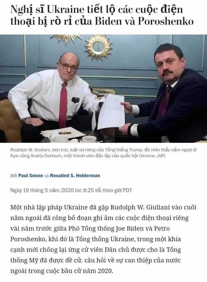 Chuyện ông luật sư riêng của Tổng thống Trump là ông Rudy Giuliani tiếp xúc với Andriy Derkach hay Tổng thống Trump đăng lại băng ghi âm do Andriy Derkach phát hành là chuyện bình thường trong quá trình ông Giuliani đi tìm ra sự thật cũng như ông Donald Trump làm động tác đăng lại thông tin đa chiều từ công luận mà thôi, nó không hề hấn gì tới sự nghiệp chánh trị của ông Trump và ông Giuliani cho dù ông Andriy Derkach bị Bộ Ngân khố Hoa Kỳ đưa vào danh sách trừng phạt tội can thiệp vào bầu cử Hoa Kỳ.