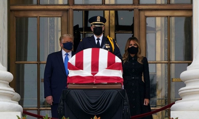 Tổng thống Mỹ Donald Trump đeo khẩu trang đen, cùng Đệ nhất phu nhân Melania đứng lặng lẽ sau linh cữu phủ quốc kỳ của cố thẩm phán Ginsburg, người qua đời vì vì ung thư ở tuổi 87 cuối tuần trước. Linh cữu bà Ginsburg được đưa tới Tòa án Tối cao từ 23/9 để người dân tới tưởng nhớ trong ba ngày.