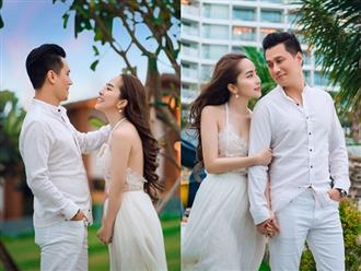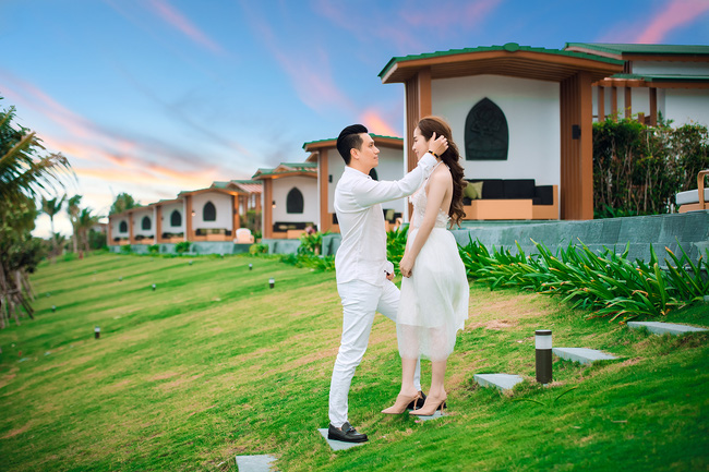 Trong ảnh, nàng "cá sấu chúa" diện đầm trắng gợi cảm, tạo dáng e ấp và nắm tay nam diễn viên "Người phán xử" một cách ngọt ngào. Việt Anh cũng vô cùng phong độ khi diện trang phục trẻ trung. Anh không ngại ôm, vuốt tóc và làm nhiều hành động "tình bể bình".