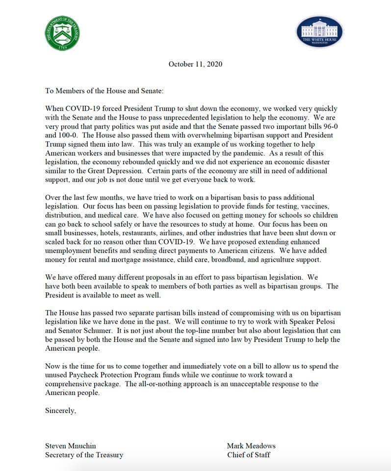 "Đây là luc' để chúng ta đến với nhau và bỏ phiếu ngay lập tức về một dự luật cho phép chúng ta xử dụng ngay các ngân quỹ của chương trình bảo vệ Paycheck chưa dùng ! Để chúng ta tiếp tục làm việc hướng tới một gói toàn diện. Mọi cách cư xử bác bỏ chương trình cứu trợ đồng bào là một phản ứng không thể chấp nhận được đối với người dân Hoa Kỳ "