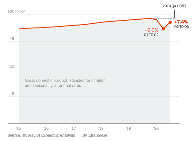 Sự phục hồi được thúc đẩy một phần nhờ hàng nghìn tỷ USD cứu trợ các hộ gia đình và doanh nghiệp mà Mỹ tung ra hồi đầu năm. Số liệu GDP cũng là dữ liệu kinh tế quan trọng cuối cùng được công bố trước cuộc bầu cử tổng thống vào tuần sau.