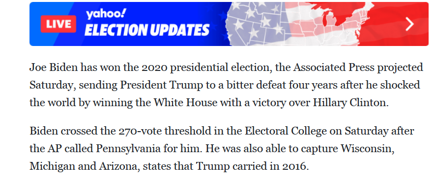 With Pennsylvania's 20 electoral votes, Biden now has a total of 273 electoral votes.