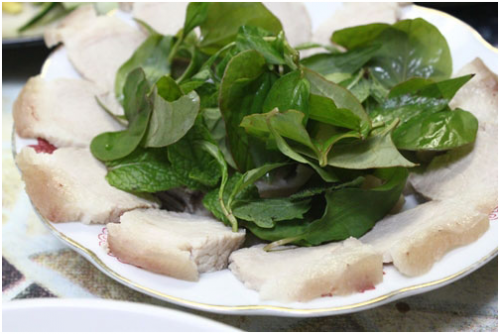 – Thịt chín lấy ra thái lát vừa ăn bằng lóng tay, xếp lên đĩa.