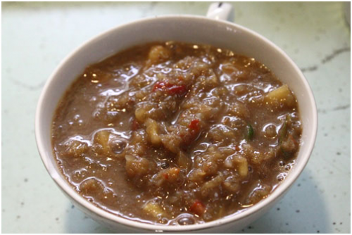 – Băm nhuyễn dứa, giã nhuyễn tỏi, ớt và đường trộn vào mắm nêm