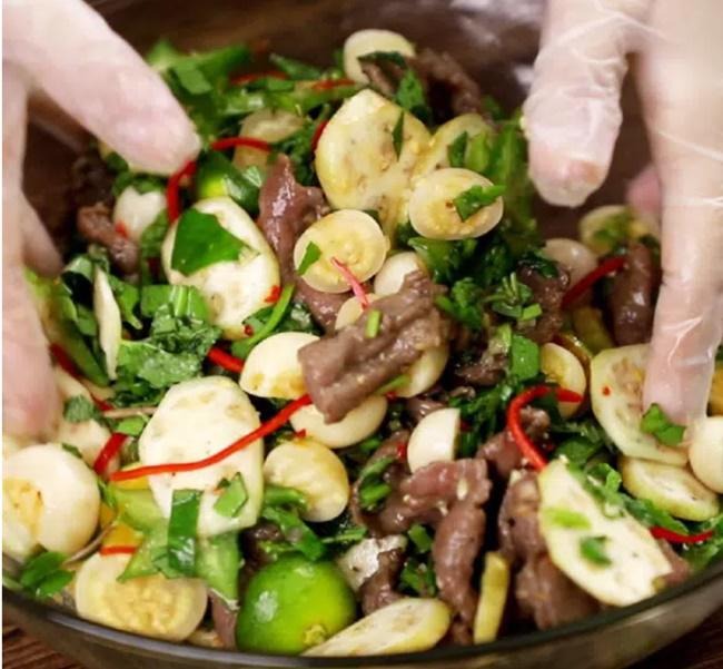 - Chuẩn bị âu to cho thịt bò, khế, chuối chát, cà pháo, rau thơm, ớt cắt sợi. Cho nước trộn gỏi vào trộn đều. Cho ra đĩa thêm ít mè rang và rau thơm lên trên mặt.