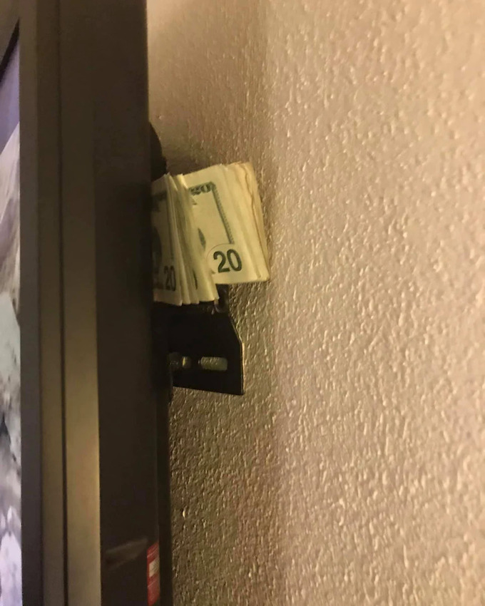 Người đàn ông thuê phòng đã tìm thấy một xấp tiền 20 USD, tổng trị giá 480 USD ở mặt sau TV. Ảnh: Facebook