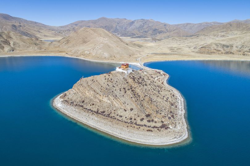 Ngôi đền tọa lạc ở giữa hồ Yamdrok, Tây Tạng.