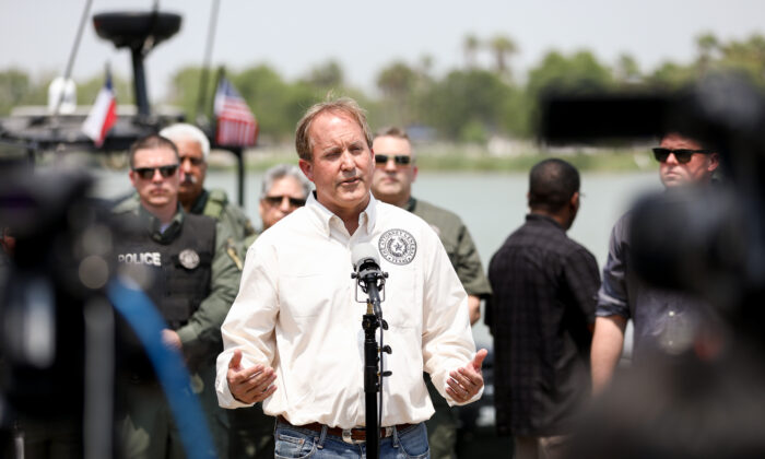 Bộ trưởng Tư pháp Texas Ken Paxton trong một cuộc họp báo ở Công viên Anzalduas gần McAllen, Texas, vào ngày 28 tháng 4 năm 2021. (Charlotte Cuthbertson / The Epoch Times)
