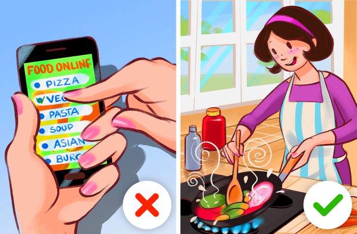 Khi bạn sống xa nhà và không có thời gian nấu nướng, bạn có thể hình thành thói quen gọi đồ ăn hết lần này đến lần khác. Điều đó có nghĩa là bạn bắt đầu bội chi vào thực phẩm và bạn có thể không đủ ổn định về tài chính để có thể chi trả khoản chi tiêu này. Thay vào đó, hãy đến cửa hàng tạp hóa, mua các sản phẩm bạn cần và tự nấu ăn. Nếu bạn không thể nấu ăn, bạn nên cố gắng học cách làm.
