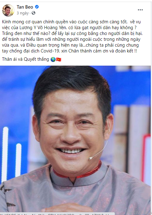 Mới đây, trên trang Facebook cá nhân, nghệ sĩ Tấn Beo bất ngờ đăng đàn về lùm xùm. Anh hi vọng cơ quan chức năng sớm vào cuộc điều tra “thần y” Võ Hoàng Yên để đòi lại công bằng cho người bị hại. Đồng thời, tránh hiểu lầm cho người ngoài cuộc. Phía dưới bài viết, nhiều người đồng tình với quan điểm này của Tân Beo. Phát ngôn tuy nhẹ nhàng nhưng lại đủ sức thuyết phục.