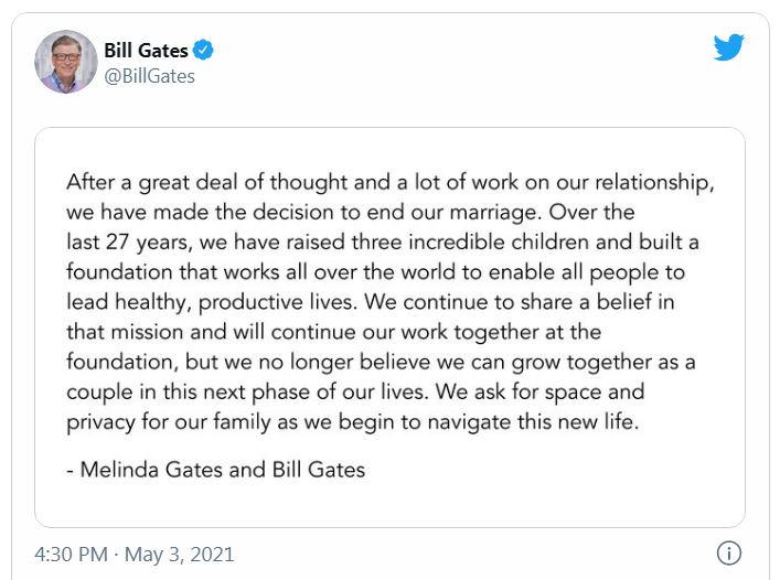 'Trong 27 năm qua, chúng tôi đã nuôi dạy ba đứa trẻ đáng kinh ngạc và xây dựng một nền tảng hoạt động trên toàn thế giới để giúp tất cả mọi người có cuộc sống lành mạnh và hiệu quả. Chúng tôi tiếp tục tin tưởng vào sứ mệnh đó và sẽ tiếp tục làm việc cùng nhau tại quỹ, nhưng chúng tôi không còn tin rằng chúng tôi có thể phát triển cùng nhau như một cặp vợ chồng trong giai đoạn tiếp theo của cuộc đời. Chúng tôi yêu cầu không gian và sự riêng tư cho gia đình của chúng tôi khi chúng tôi bắt đầu điều hướng cuộc sống mới này. '
