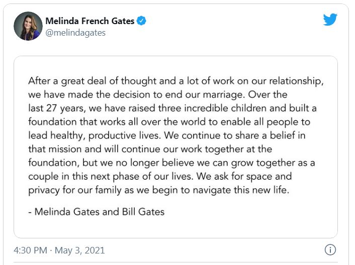 Lý do đằng sau sự chia tay của họ sau hơn một phần tư thế kỷ vẫn còn là một bí ẩn nhưng Melinda trước đó đã cho rằng chồng cô gặp khó khăn trong việc cân bằng giữa công việc và gia đình.